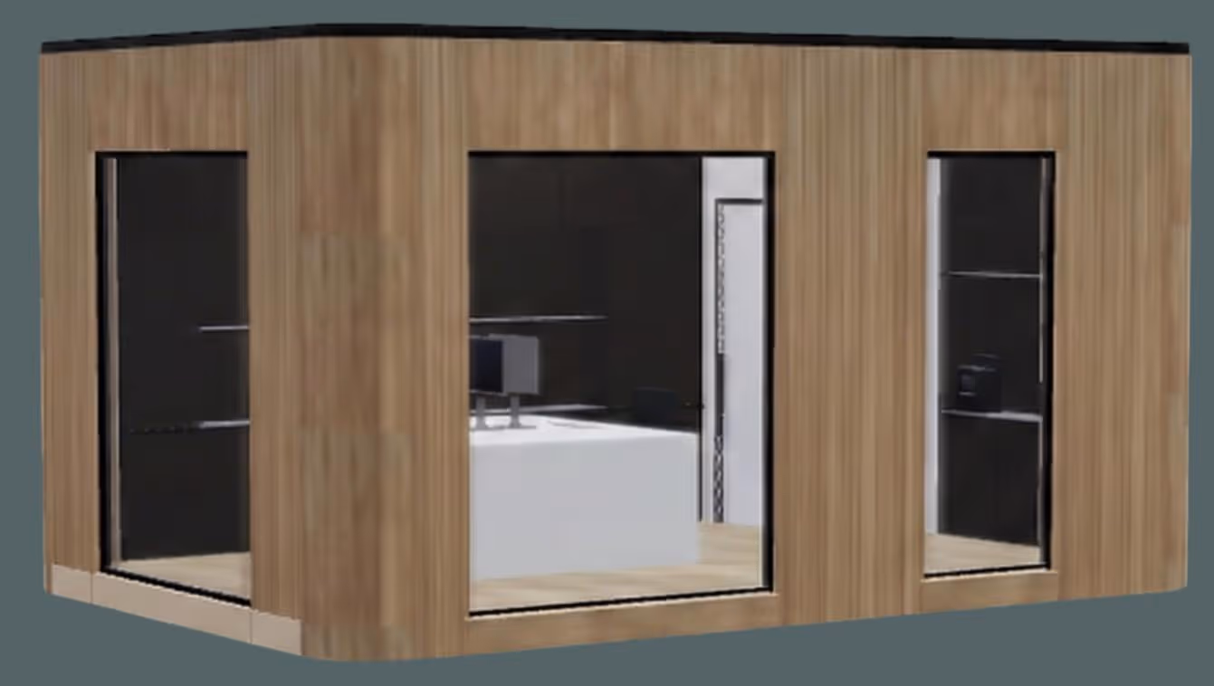 Een ruime modulaire kantoorunit met keuken en verschillende werkzones voor teams die meer comfort en functionaliteit nodig hebben.