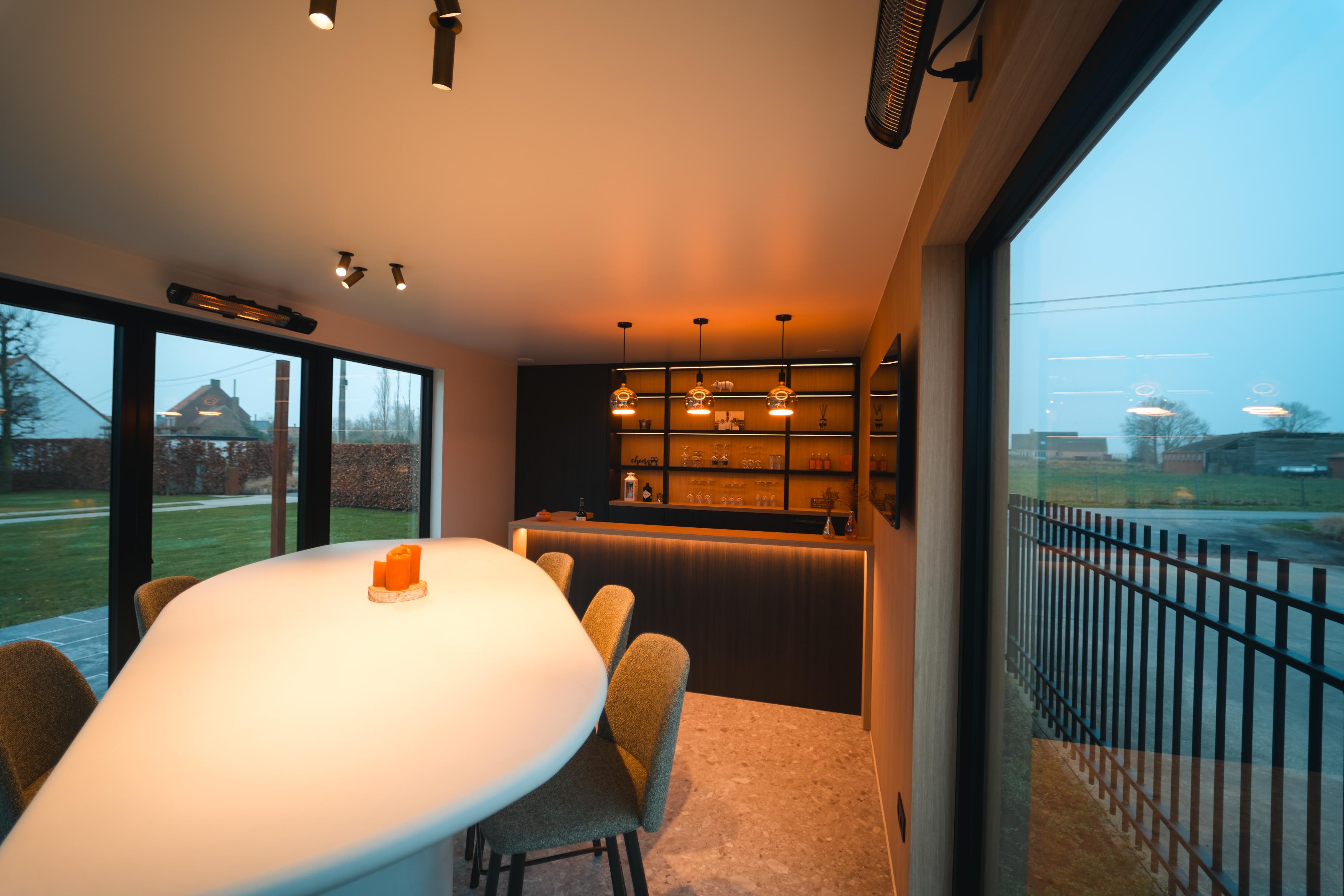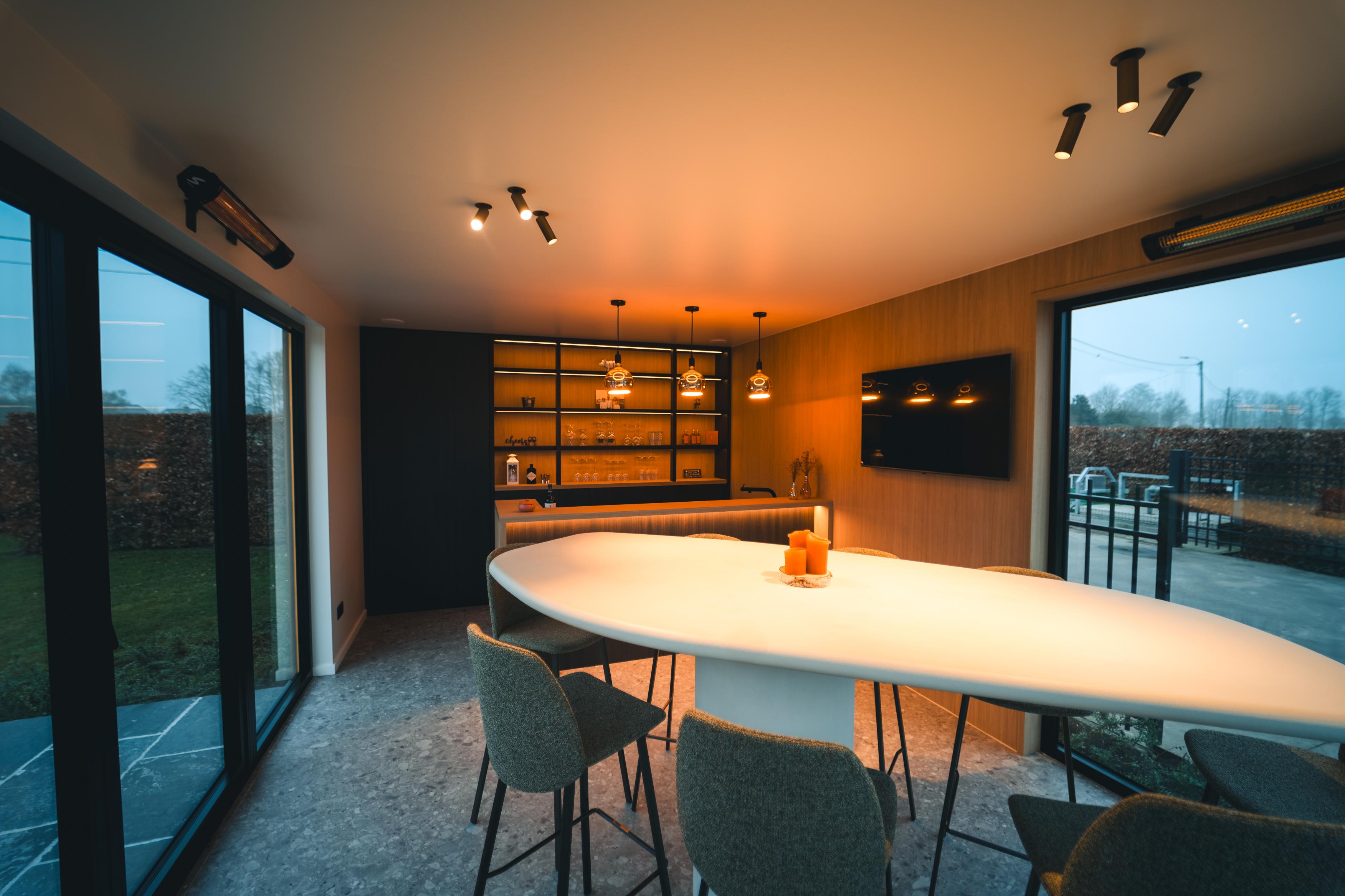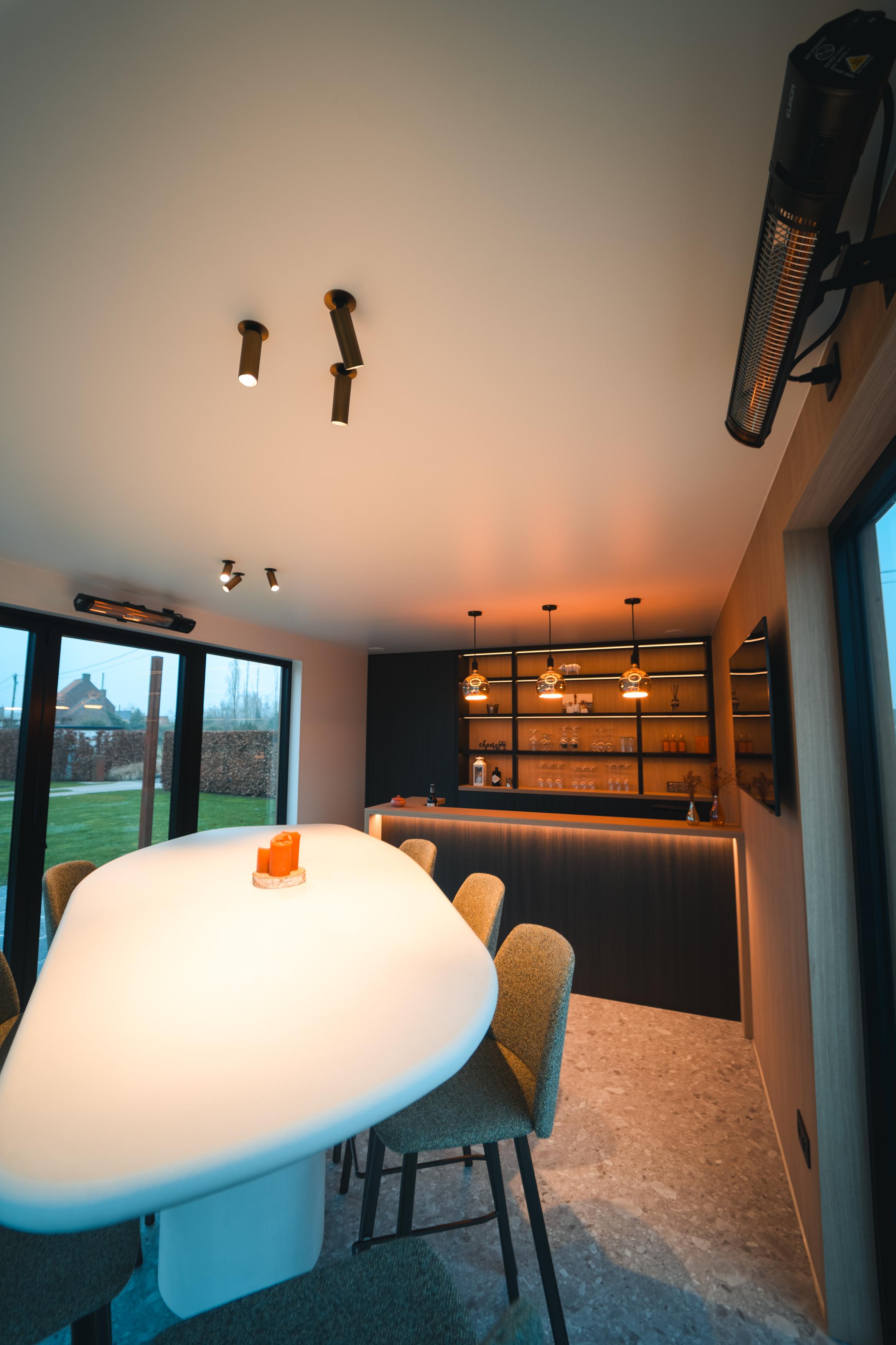 Binnenin werd gekozen voor een stijlvolle clickvinyl vloer die zorgt voor een duurzame en onderhoudsvriendelijke afwerking. De volledig op maat gemaakte bar vormt het centrale element van het poolhouse en sluit perfect aan bij de wensen van de klant. De designverlichting zorgt voor extra sfeer en een luxueuze uitstraling, terwijl één volledige wand werd afgewerkt in Clickwall Master Oak voor extra warmte en karakter. Daarnaast werd een verborgen opbergruimte subtiel geïntegreerd, zodat functionaliteit en esthetiek perfect samenkomen.