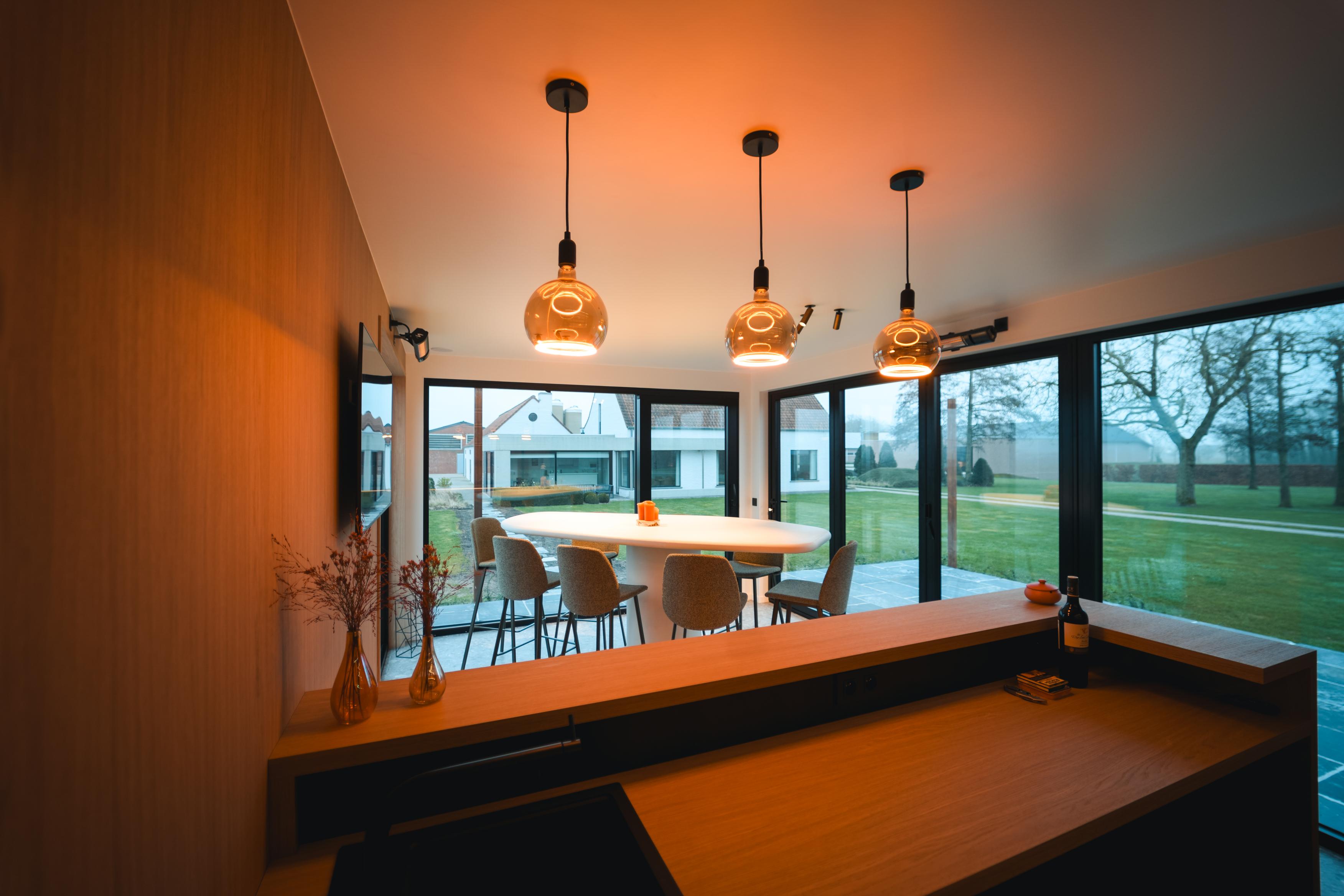 Het exterieur werd afgewerkt met hoogwaardige thermo ayous gevelbekleding, gecombineerd met een strakke witte composiet boord voor een moderne en stijlvolle uitstraling. Het aluminium schrijnwerk zorgt voor een duurzame en elegante afwerking, terwijl de subtiele buitenverlichting het poolhouse ook ’s avonds extra sfeer en klasse geeft.