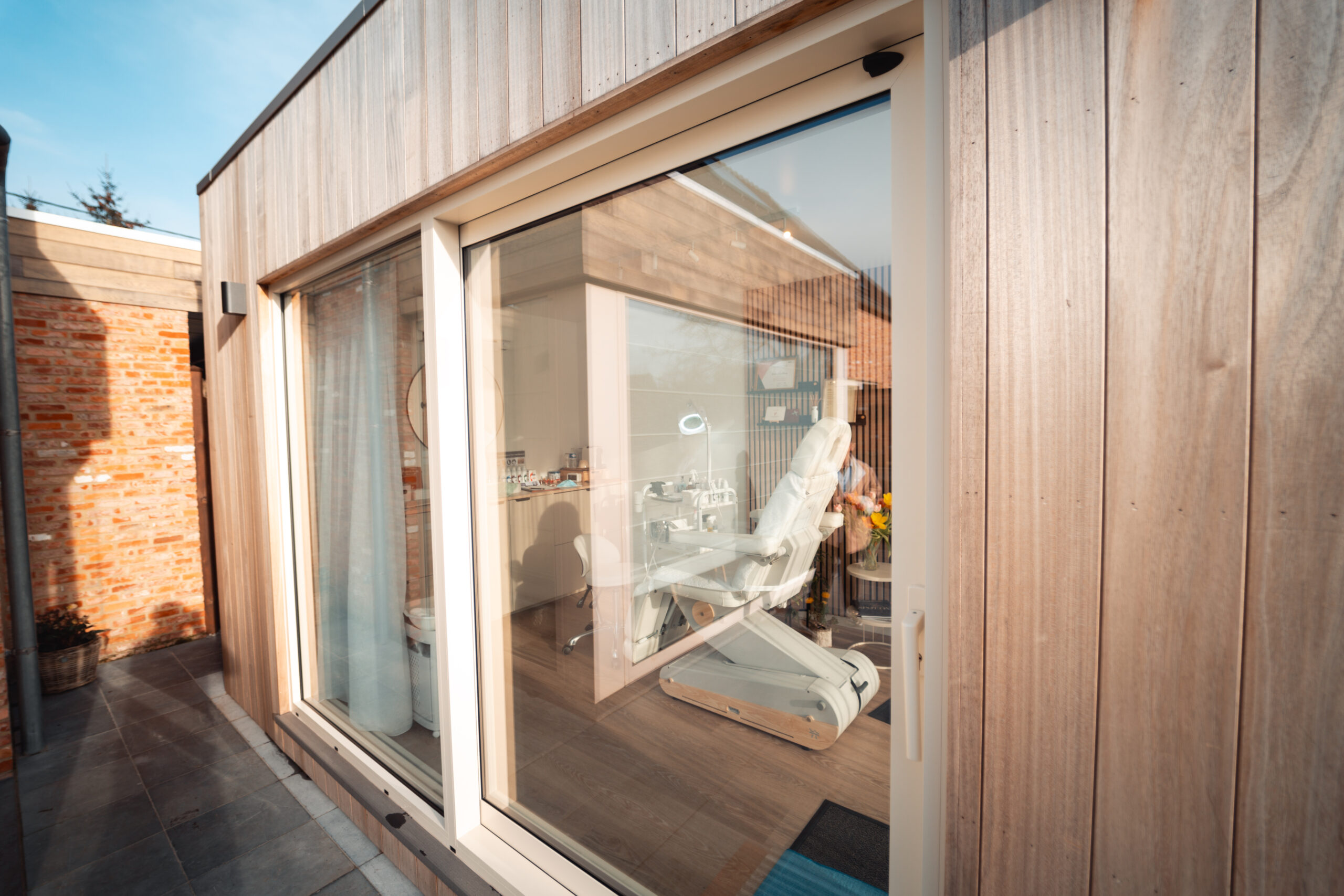 De modulaire praktijkruimte werd ontworpen als een rustige en discrete plek waar klanten zich meteen welkom voelen. Dankzij het compacte en strakke ontwerp past de unit perfect in de tuinomgeving.