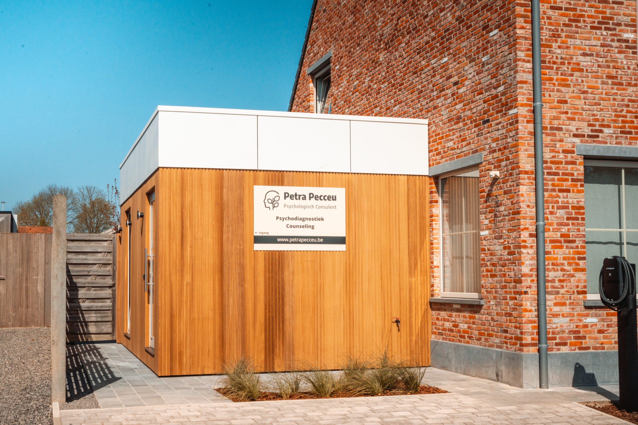 Voor deze praktijkruimte in Roeselare werd gekozen voor een modulaire oplossing die functionaliteit, comfort en energiezuinigheid combineert. De unit werd volledig op maat ontworpen zodat psycholoog Petra Pecceu cliënten kan ontvangen in een rustige en professioneel ingerichte omgeving.
